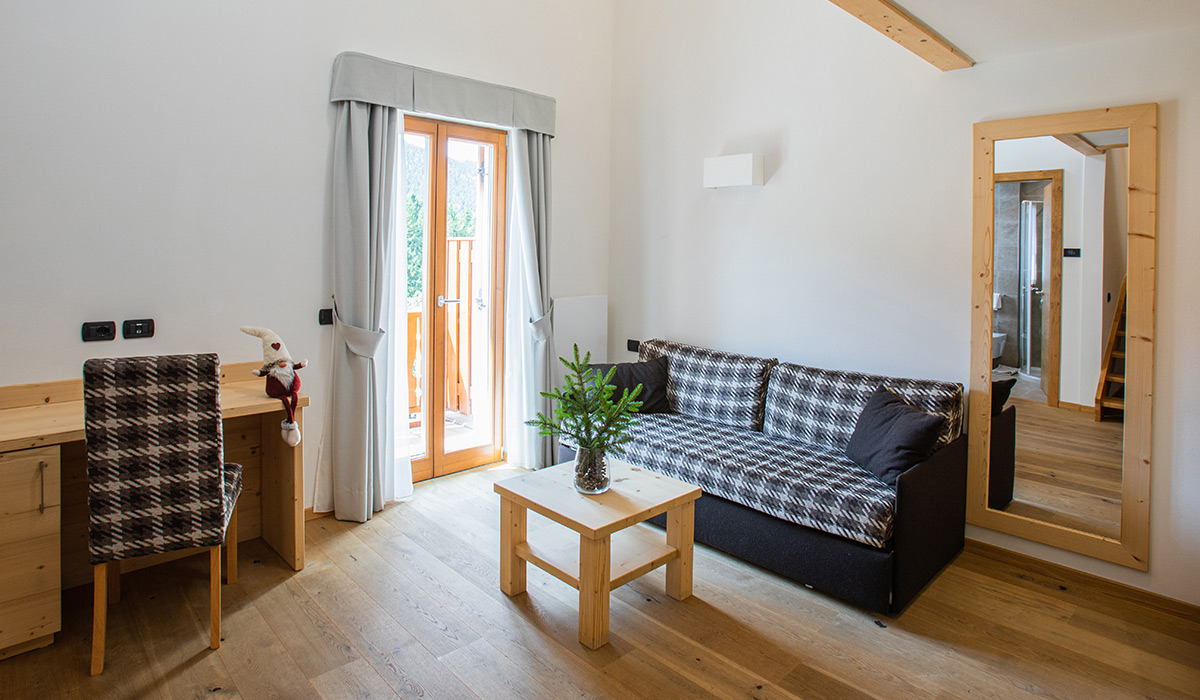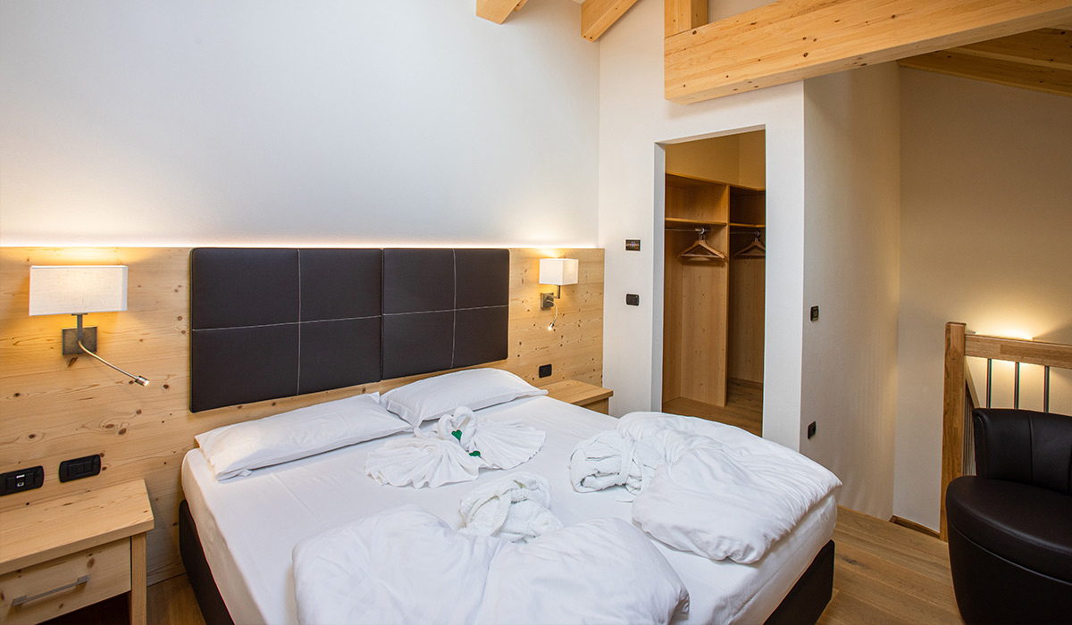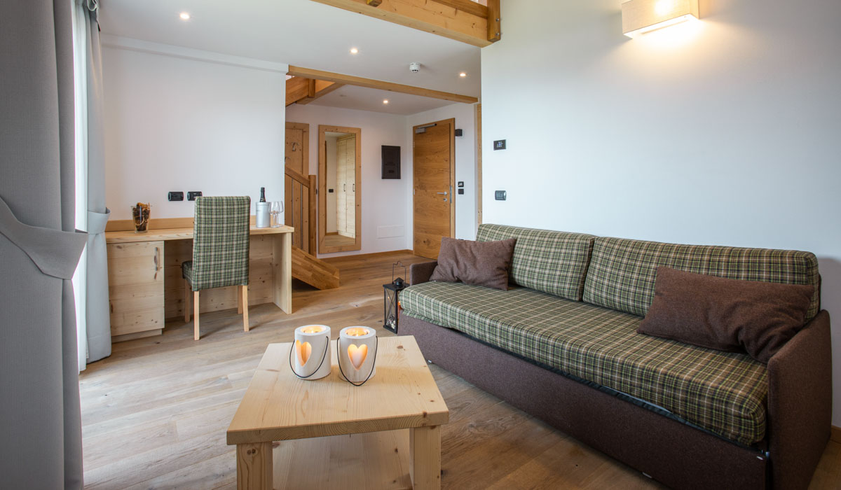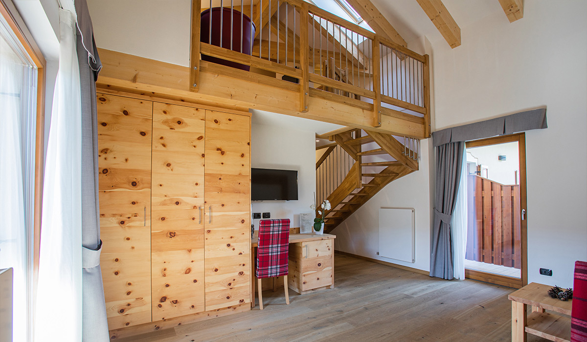 Le Junior Suite Stella Alpina sono caratterizzate da un’ampia metratura e dal balcone panoramico. Salottino e soppalco garantiscono inoltre il massimo del comfort e della privacy.