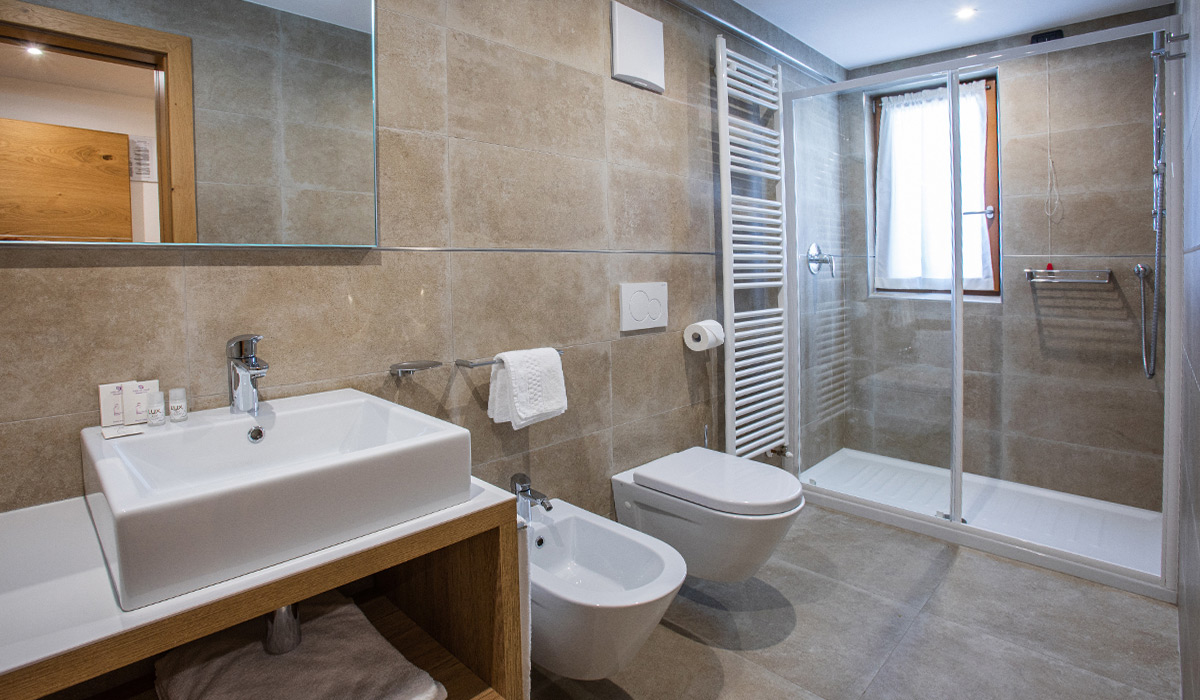 Le Junior Suite Stella Alpina sono dotate di telefono, servizio sveglia, 2 televisori LCD satellitari, cassaforte, frigobar, internet WI-FI free, bagno privato con phon, servizi di cortesia.